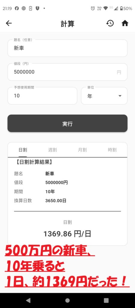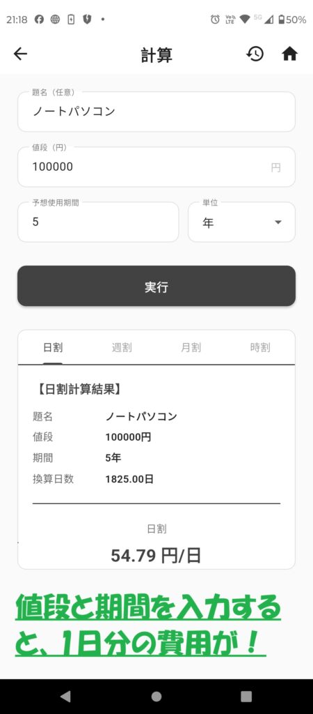 金額と使用期間を入れるだけで、日割・週割・月割(ヵ月)・時割を一発換算。