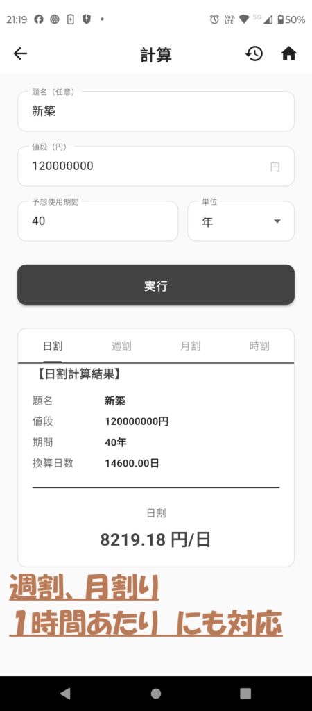 • 日割/週割/月割(ヵ月)/時割 をワンタップで換算